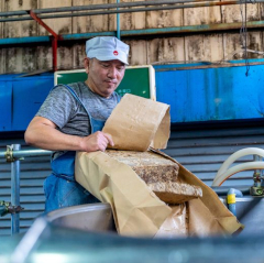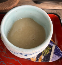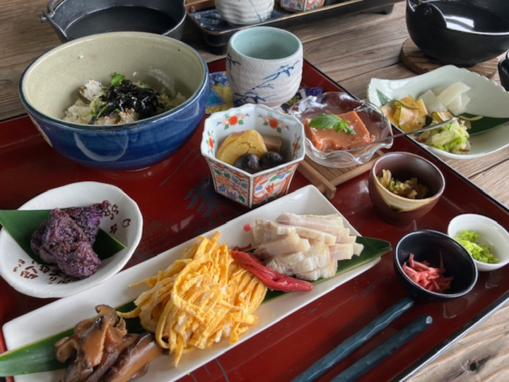 2026年1月23日 / 最終更新日時 : 2026年1月26日 ihcsacafe_user 全ての記事 奄美大島の自然と恵み Part Two ~黒糖焼酎と奄美の食~ 奄美大島の自然と恵み Part Two ~黒糖焼酎と奄美の食~ 印刷用PDF 初めての土地に行ったら、その土地の料理が食べたい。そして、個人的には地酒が飲みたい。記者の知人であり、奄美大島のツアー会社アマニコガイドサービスのガイドである佐藤伸一郎さんに、奄美の食を探求する1日ツアーを企画してもらった。伝統的な「島めし」、奄美地方でしか作ることができない「黒糖焼酎」、そしてその酒に合う「地魚」に巡り会った1日を写真と共にご紹介する。 自然の恵みを食べる(島めし屋かのう) ランチは佐藤さんお勧めの「島めし屋かのう」で、伝統的な「島飯」をいただいた。実は島の北と南で島飯の肉が違う。南は沖縄の影響を受けた豚肉で、北は江戸時代薩摩藩の役人をもてなしたともいわれる鶏肉だ。奄美大島の中心である奄美市では「鶏飯(ケイハン)」の看板を目にすることが多く、お土産屋で売っているのも鶏飯である。島めし屋かのうは島の南部瀬戸内町にあり、南の豚飯(ブタミシ)のランチセット「豚飯(かのうでは『トンハン』と呼ぶ)」がメインだ。 島めし屋かのうのご主人叶辰郎(かのうたつろう)さんは、「自然栽培黒糖を作る百姓」と自ら名乗り、農薬を使わず肥料もほどこさないでサトウキビや野菜・柑橘類などを作っている。また、奥様の淳子さんはご主人の作る美味しい黒糖や農作物を材料として、奄美の自然を感じられる料理に腕を振るう。 叶辰郎、淳子夫妻 ランチセットを写真で紹介すると、手前の横長の皿にある白いものが塩抜きした豚肉。豚飯の豚肉は、その昔冷蔵庫が存在しない頃に保存食であった塩漬けの豚肉を使う。塩漬け肉は猛烈に塩辛いので、何日も水に浸けて塩気を抜くそうだ。豚肉の隣が島鶏の錦糸卵とシイタケ。その左上が島の紫山芋をモチモチ食感に揚げたもので、右隣の煮物のサツマイモ同様ご主人が作った野菜だ。 右の小鉢3つが薬味で、ピンクが島ショウガ、オレンジ色に緑のラインがパパイヤ漬薄切り、そして青いレモン皮のみじん切りなど、全て辰郎さんが育てたものを淳子さんが調理している。 お膳の一番上にある丼は出汁で炊いたご飯で、これにおかずや薬味などをのせて食べる。まずおかずをそれぞれ食べて、次にご飯にのせて食べ、最後は上の写真右奥に半分写っている小鍋に入った出汁をかけて、お茶漬けのようにして食べる。自然栽培の野菜はもちろん、塩抜きした豚肉も、豚飯にかけて食べる出汁も全てが優しい味だ。出汁の味は東京のお雑煮の澄まし汁に豚のエキスを加えた感じで、これまで食べたことのないこの島の味なのだと思った。 ローゼルの果実 ローゼルの果実のガクと苞(ほう)を乾燥させて作るローゼルティー 料理だけでなく、飲物にも島の恵みがあふれている。セルフサービスのドリンクバーには、レモングラス・月桃(げっとう)・ローゼルなどハーブティーが並ぶ。ローゼルをホットで飲んでみた。お湯を入れるとピンク色に染まりだし、しばらく待つとハイビスカスの花のような濃いピンクの液体になる。奄美大島にしては涼しく、叶さん夫妻は「寒い」という11月の雨の日には、心身温まる気がするハーブティーだった。 それにもう1つ、不思議な飲物「みき」がご飯のかたわらに添えられている。奄美から沖縄、宮古、八重山諸島に至る弓状に連なる島々で、原材料や製法は異なるものの神事や祭りにおいて神様に捧げる発酵飲料だ。「みき」は「神酒(みき)」に由来すると言われている。今回いただいたのはサツマイモと米のみきに黒糖を加えたもので、植物性であるにもかかわらずヨーグルトのように乳酸菌を多く含む。つまり乳製品にアレルギーがある人や、動物由来の食品を避けている人でも乳酸菌飲料として飲むことができ、アルコール分はない。 サトウキビ畑 手刈り収穫したサトウキビ 食後に叶さんのサトウキビ畑を見せていただいた。叶さんのこだわりは、土作りに肥料は使わず、雑草やサトウキビの葉などを畑に戻すこと、一本ずつ手刈りをすること、薪を使って昔ながらの製糖方法で黒糖を作ること、旬の冬の時期(12月から4月)に全て収穫するのではなく、通年で収穫・製糖を行うことだそうだ。 叶さんが伝統的製法で造った黒糖 黒糖焼酎(西平本家) その日の午後は、佐藤さんが「黒糖焼酎アンバサダー」を務める蔵「西平本家(にしひらほんけ)」を訪問した。11月は焼酎造りの時期ではないので、実際に工程を見ることはできないが、シーズンが終わった蔵の中で静かにたたずむ機材を見ながら工程を教えていただいた。(写真は焼酎造りシーズン中のもの。西平本家提供写真) 工程の第一は「一次仕込み」で、原料米に麹菌をつけ約2日寝かせてから、酵母と共に水を加えて「一次もろみ」を作る。日本酒の酒蔵は何度も見学している私にとって、この工程は日本酒と同じなので驚かされた。酒類